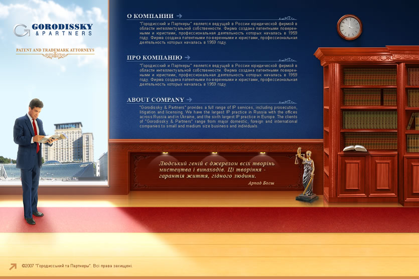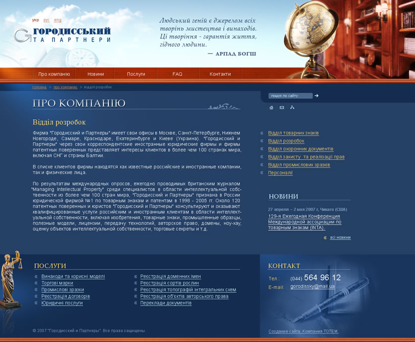 Компания является одной из ведущих фирм по защите прав на объекты интеллектуальной собственности в Украине и Европе и гордится своим более чем 40-летним опытом работы в своей сфере.