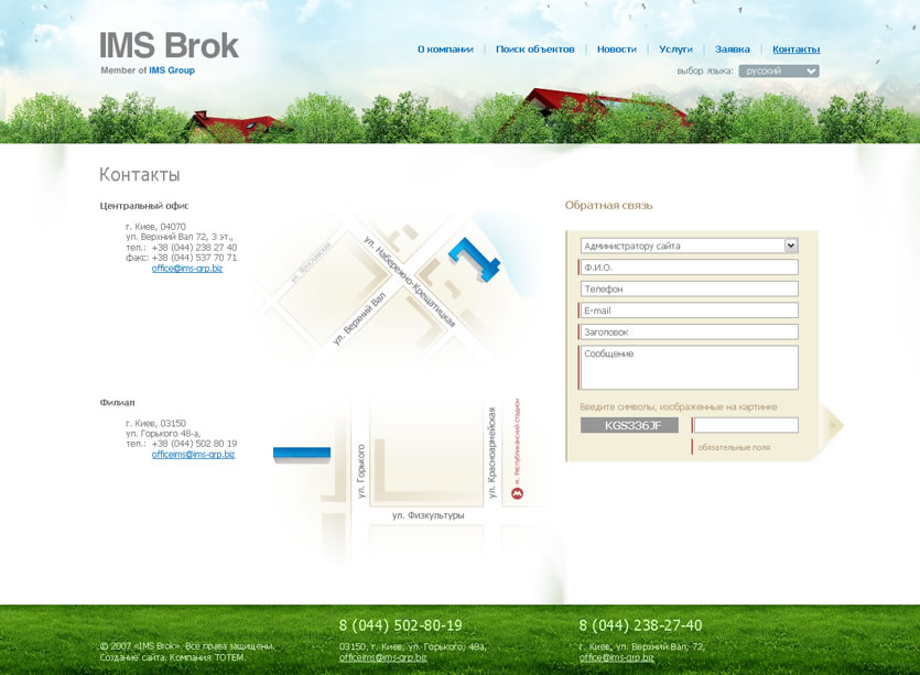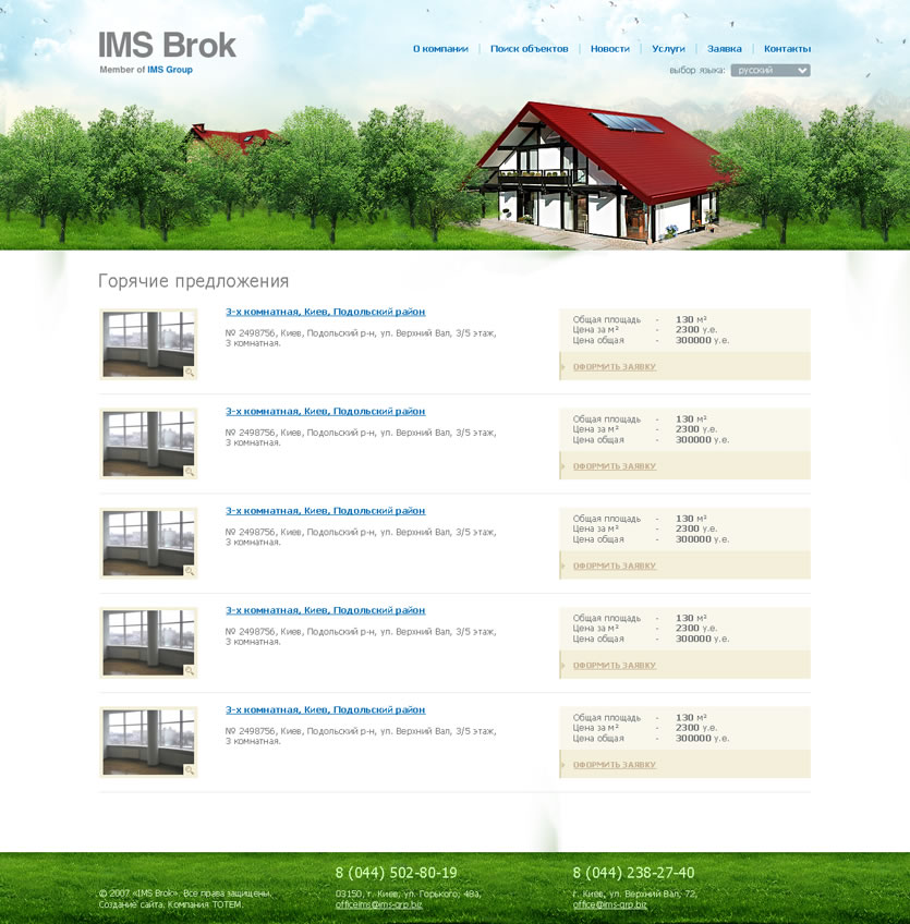 В рамках проекта «IMS Brok» разработан удобный поисковый механизм объектов, создана возможность регистрировать он-лайн заявки, а также информировать потребителя ресурса о «горящих» предложениях компании.