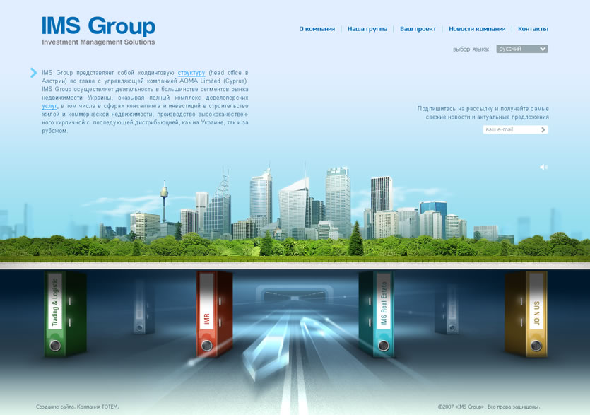 На стартовой странице сайта изображен город, который является как производителем, так и потребителем услуг холдинга.