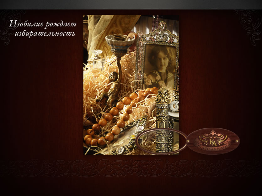 Это дало возможность подчеркнуть всё изящество предметов окружения, воссозданного с помощью фото обставленных помещений и аксессуаров крупным планом, необходимую же информацию мы разместили на старинных свитках пергамента.