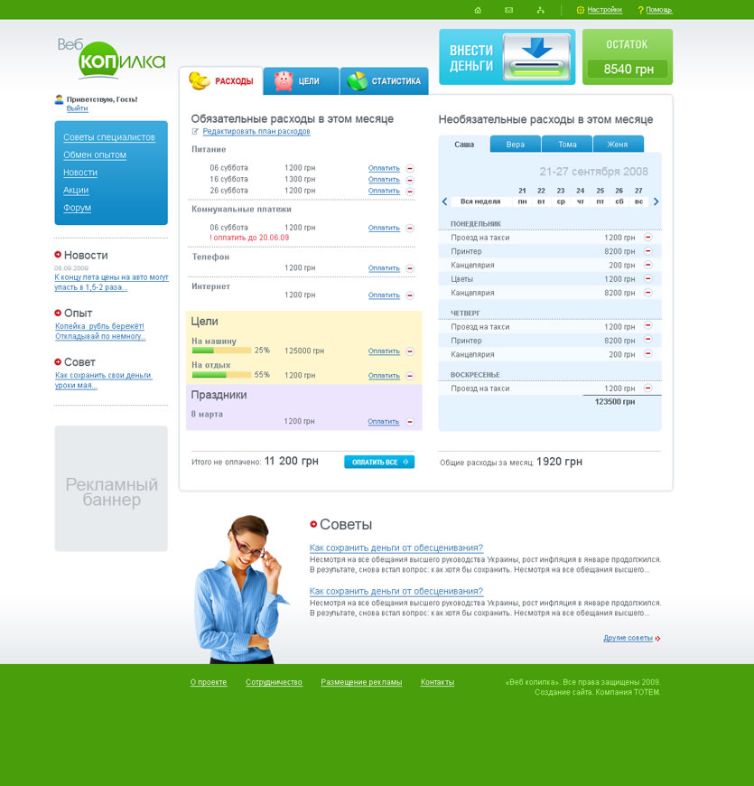 «Веб копилка» дает возможность каждому пользователю планировать свои доходы и расходы, ставить финансовые цели, получать статистику движения денежных средств за любой период времени, контролировать семейный и личный бюджет.